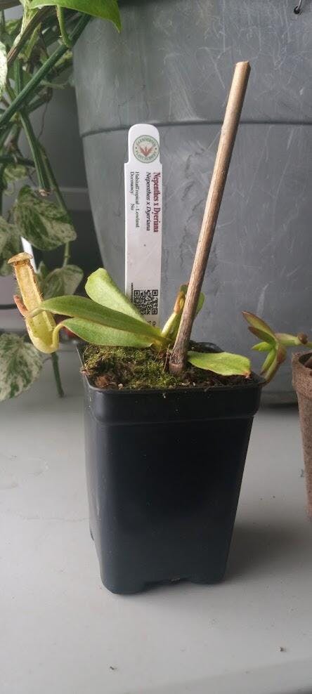 Nepenthes x Dyeriana, is a large complex hybrid first developed in the Victorian Era. Its striped, multicolored peristome and red speckled traps will make it stand out in your collection. It is a very large, robust growing carnivorous tropical pitcher plant. Its large, speckled pitchers can be over 18" with wide mouths the size of coffee cups when fully mature. It is heat tolerant and does well in a window. It is quite good at catching large insects, such as: stink bugs, wasps and yellow jackets. It is a fast grower. Stems can be trimmed to keep the plant bushy, and to start cuttings. It is a great house plant, that can be grown outdoors in the warm weather. It is suitable for beginners.