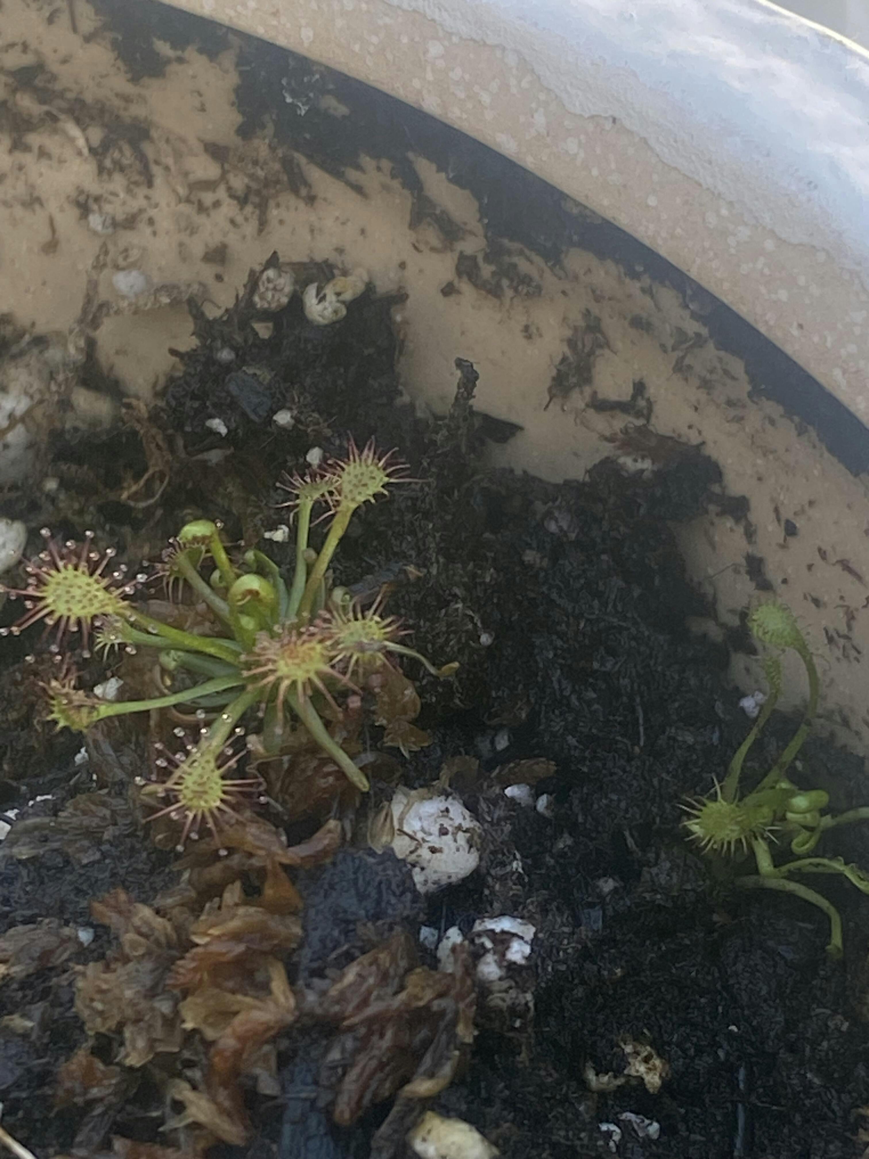 Drosera intermedia or Oblong-leaved Sundew is sometimes called the Water Sundew, and for good reason. It loves extremely wet, saturated boggy conditions, often growing on floating mats, where it can grow its largest, 3+". It can tolerate long periods of submergence and will tolerate drier periods in the summer months. It is medium height with a dazzling display of glistening tentacles in full sun, giving it a silvery appearance. The spatula-shaped leaves are green with bright red tentacles. It emerges early in the Spring and lasts throughout the Summer and Fall. It forms a sturdy winter hibernacula (resting bud), which is best pushed down to the surface in early Spring for best growth. The small flowers are white with a tint of pink on scapes with multiple blossoms. It flowers from June to August and often forms young plantlets on the flower spike (false vivipary). Oblong-leaved, water sundew frequently produce abundant seeds, giving it a nice spreading habit. Seeds need to be stratified (cold, damp winter storage), and can be stored for several years. It is wide-spread, growing from Canada to the Caribbean, where varieties do not require dormancy. Drosera intermedia is a trooper, and a great companion in the collection or growing in the bog garden. This selection comes from seed, and will show some natural variations. In it's dormant season, it will be shipped as a dormant hibernaculum. For maximum effect use multiple plants in a 6" pot.