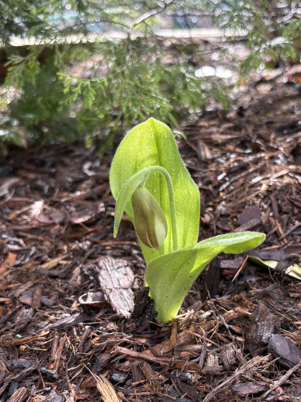 Pink Lady's Slipper Orchid, Cypripedium acaule, is one of the best known of all the hardy orchids. Pink Lady's Slipper plants have large (2-3") pink, moccasin shaped flowers resembling a swollen egg. The pouches are pink with raspberry colored veins, and an opening through which pollinating insects travel. There is no nectar, and insects have to find their way through the pouch and out the back. They probably soon learn there is little nectar available in Pink Lady's Slippers and avoid the flowers, which may be why so few are pollinated in the wild. Flowers are singular on medium height spikes, and topped by green and brownish maroon sepals. It is a late Spring, early Summer bloomer, and flowers can last up to a month or more. Lady's Slipper flower spikes benefit from staking, and protection from the wind. Two wide, long elliptical leaves rise from the base of the plant. They are rich green above and silvery green below. They are corrugated by thick, parallel veins. In their natural habit, Pink Lady's Slipper Orchids grow in open, upland woods, above bogs and fens, usually under pines. The soil is typical low nutrient, loose, well drained and humusy. It is consistently moist, but not saturated. There is frequently a layer of decomposing leaves on the soil surface. Light is shade or dappled sunlight. Plants tolerate full sun, but do not look their best. Seeds are very fine and can be a challenge to germinate. It is winter hardy, and should be protected from rodents during dormancy. Mulch with 4+" of pine needles in the Fall. Leave at least a 1" of needles after spring cleanup. The rhizomes can be stored in damp sphagnum at 35°F (2°C) in a refrigerator for 3 or 4 months. Water with rain/distilled water, they are sensitive to mineral buildup. Do not over water, and be sure to keep the soil slightly moist during the peak of summer. Keep soil acidic and provide good drainage. Fertilizing is beneficial during the formation of Spring shoots. Consider 3 month slow release 14:14:14 Osmocote. C. acaule does well in beds and pots, and makes a charming addition to the bog garden.